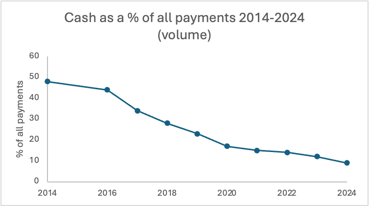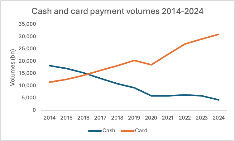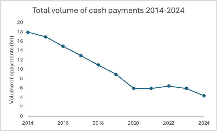 The headline finding from this year’s report informs us that in 2024 cash payments accounted for 4.4 billion payments, 9% of the total volume. It notes that cash payments have been declining over the past two decades (see chart below) and 2024 marks a new threshold as cash for the first time amounted for less than 10% of all payments ending its role as the second most used payment method in the UK, falling behind Direct Debits, Faster Payments and credit cards.