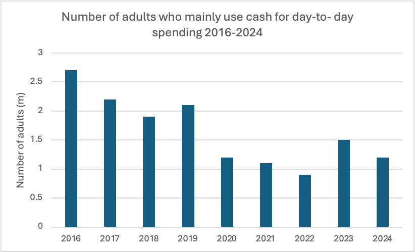 The survey also provides a number for people who mainly use cash for day-to-day spending and rarely use a digital alternative. In 2024, this accounted for 2.1% of the adult population, or 1.2 million people. As the chart below shows, this has fallen from 2.7 million in 2016 but has increased from 0.9 million in 2022. The increase seen in 2023 is likely due to budget management during the height of the cost-of-living crisis.