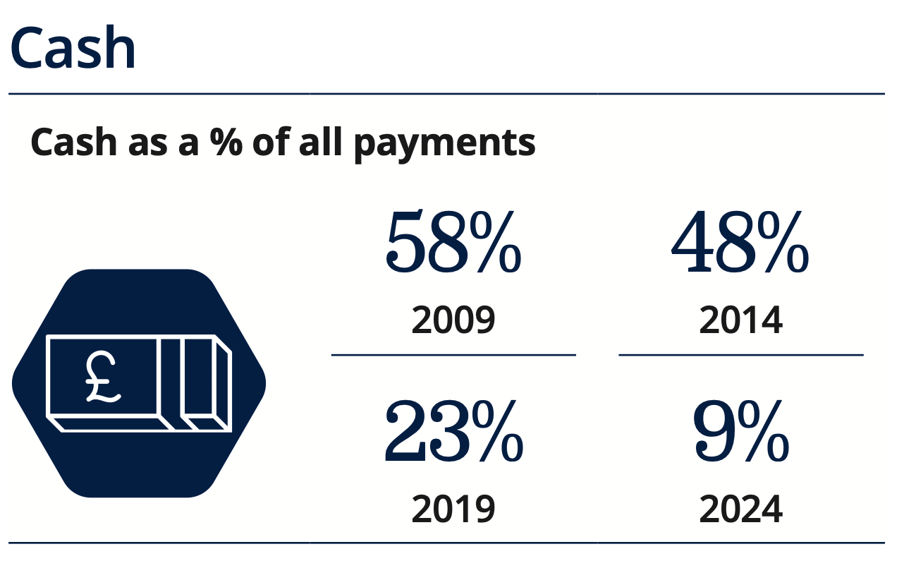 Cash payments in the UK continued their long-term decline, dropping to 4.4 billion in 2024 and falling from 12% to 9% of all transactions. For the first time, cash was no longer the second most used payment method, overtaken by Direct Debits, Faster Payments, and credit cards.