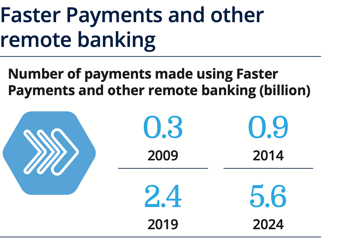 Faster Payments accounted for 50% of all business payments in 2024, having overtaken Bacs Direct Credit as the most-used method. Use of Faster Payments and remote banking is set to surge, reaching an estimated 7.2 billion payments by 2034.