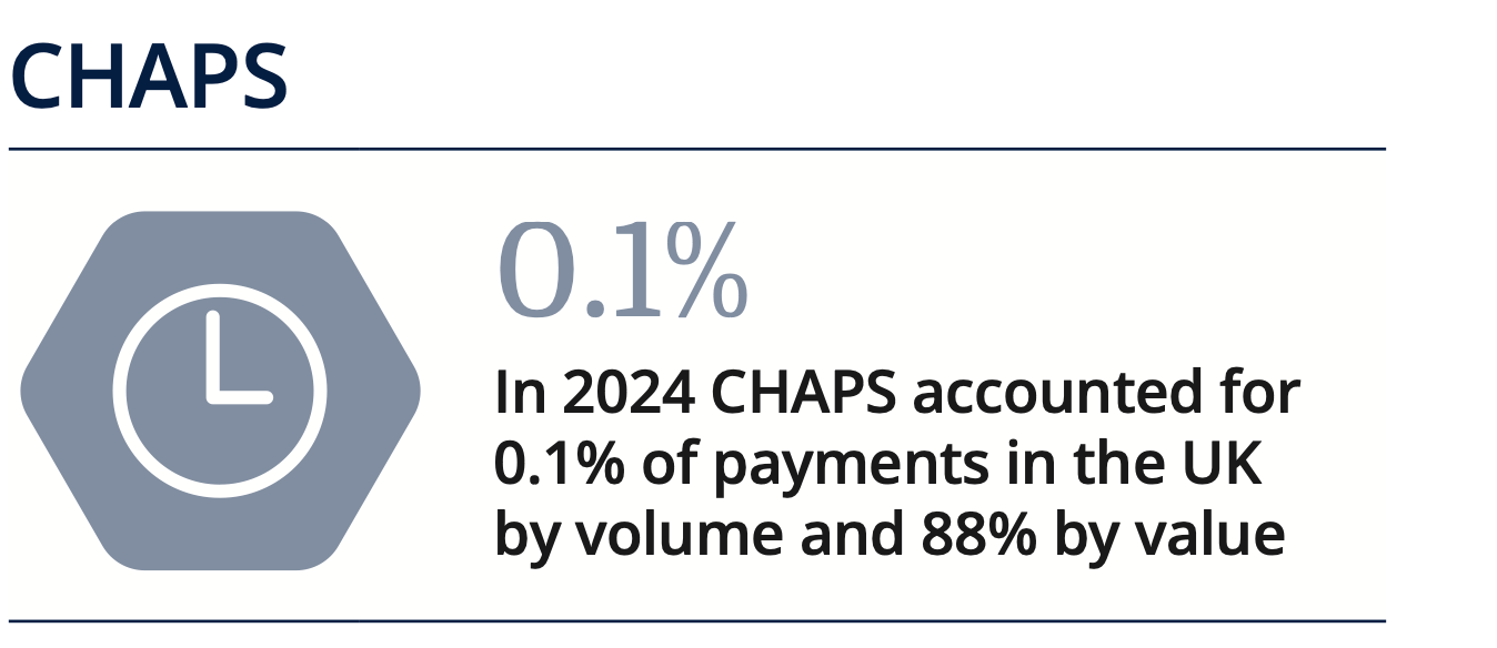 CHAPS, used mainly for wholesale and corporate treasury payments, made up just 0.1% of UK payment volumes in 2024, with 52.7 million payments totaling £87.5 trillion. Its usage closely mirrors the state of the UK economy.