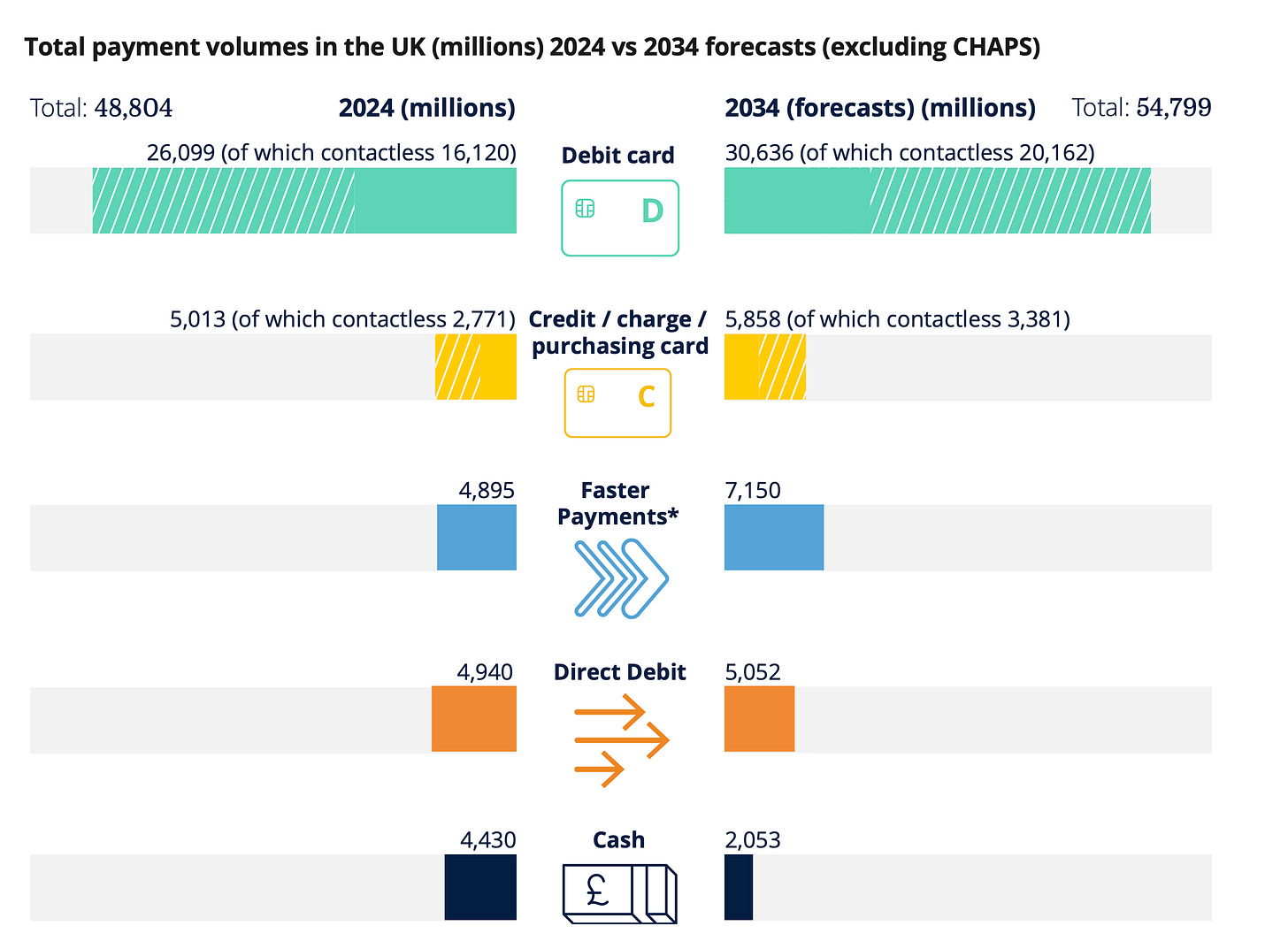 A summary of the latest report (it will be a while before 2025 data is published) can be found at: UK Finance - UK Payment Markets 2025 and the full report is available free of charge for some members of UK Finance and available for purchase by others at: www.ukfinance.org.uk.